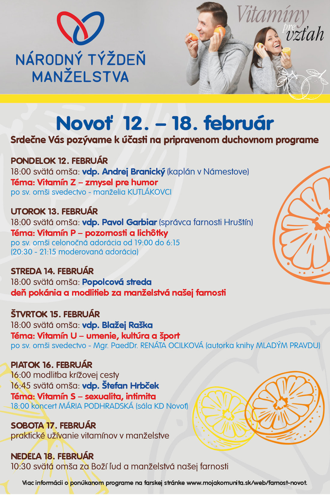 Spolu s pastoračnou radou a ochotnými farníkmi Vám, milí manželia (a snúbenci), aj tento rok ponúkame národný týždeň manželstva, ktorého cieľom je priniesť nové inšpirácie pre manželskú lásku.
