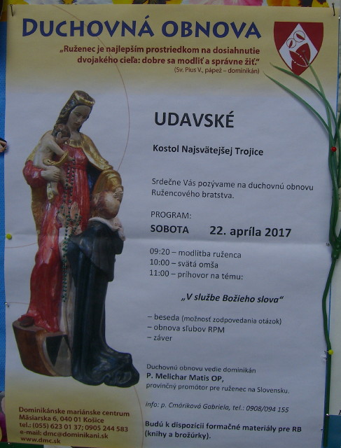 V sobotu 22. 4. 2017 sa v obci Udavské v kostole Najsvätejšej Trojice konala duchovná obnova ružencového bratstva, ktorú viedli bratia dominikáni Melichar Matis, Alan Dely a Jozef Zummer.